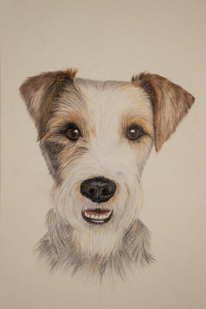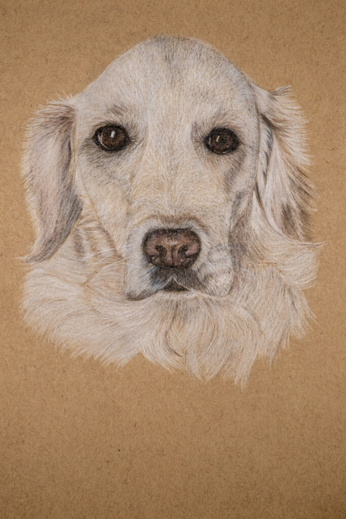 Die gezeichneten Fellstrukturen geben ihm eine besondere Tiefe, und man erkennt die Ruhe und Treue eines Hundes, der viele Jahre an der Seite seines Menschen verbracht hat.