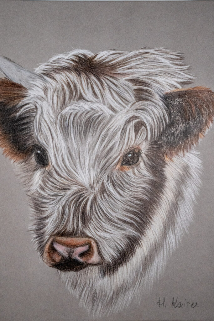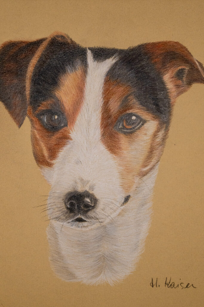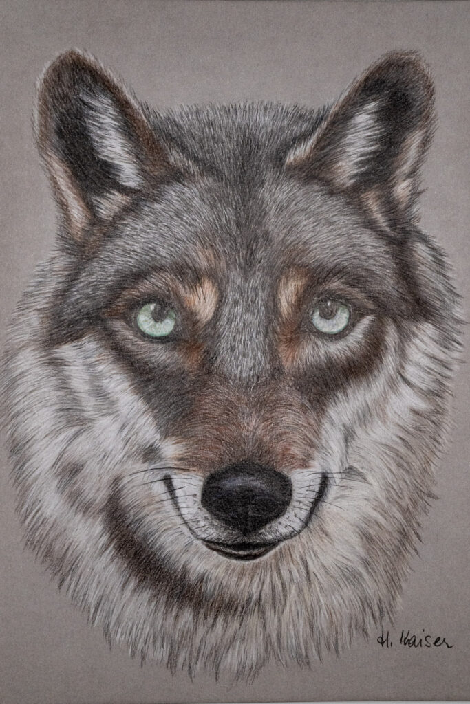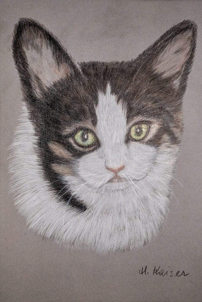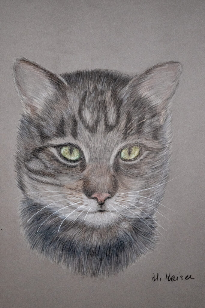 Die Bleistift- und Farbstiftzeichnungen von Heidemarie Kaiser bewegen sich zwischen Detailtreue und künstlerischer Interpretation. In ihren Arbeiten stehen Tiere im Mittelpunkt – ihre Blicke, ihre Gesten und ihre charakteristischen Züge.