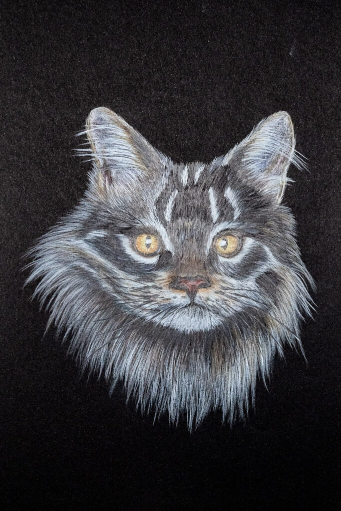 Die gelbgrünen Augen blicken direkt und fordern Aufmerksamkeit. Diese Zeichnung vermittelt gleichzeitig Sanftheit und Stärke – Eigenschaften, die Katzen zu so besonderen Begleitern machen.