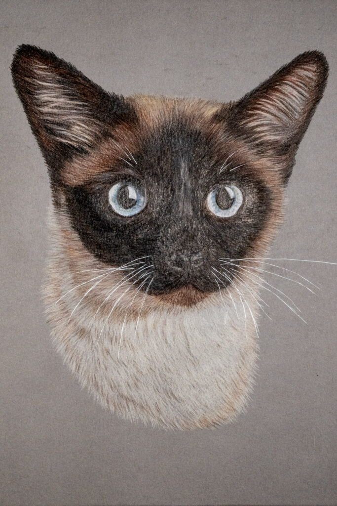 Die zarten Fellfarben in Creme- und Brauntönen sind in filigranen Schichten dargestellt, wodurch die typische Eleganz dieser Katzenrasse perfekt eingefangen wird.