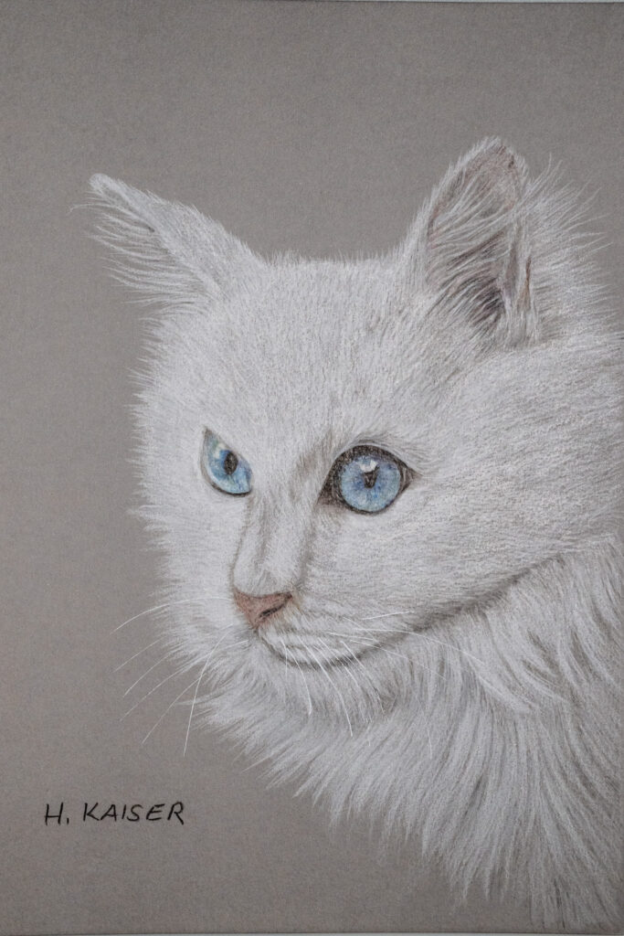 Diese Zeichnung zeigt eine weiße Langhaarkatze mit klaren, eisblauen Augen. Ihr Blick ist ruhig und wachsam, fast königlich.