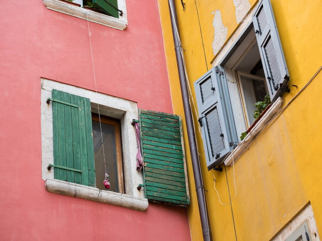 Zwei Hauswände stehen nebeneinander wie zwei Stimmen in einem Gespräch – links ein sattes Rosa, rechts ein sonniges Gelb, getrennt nur durch ein schmales Fallrohr aus Metall. Die Farben strahlen wie frisch aufgetragen, und doch verraten kleine Risse und abblätternde Stellen, dass hier die Zeit mitgemalt hat.