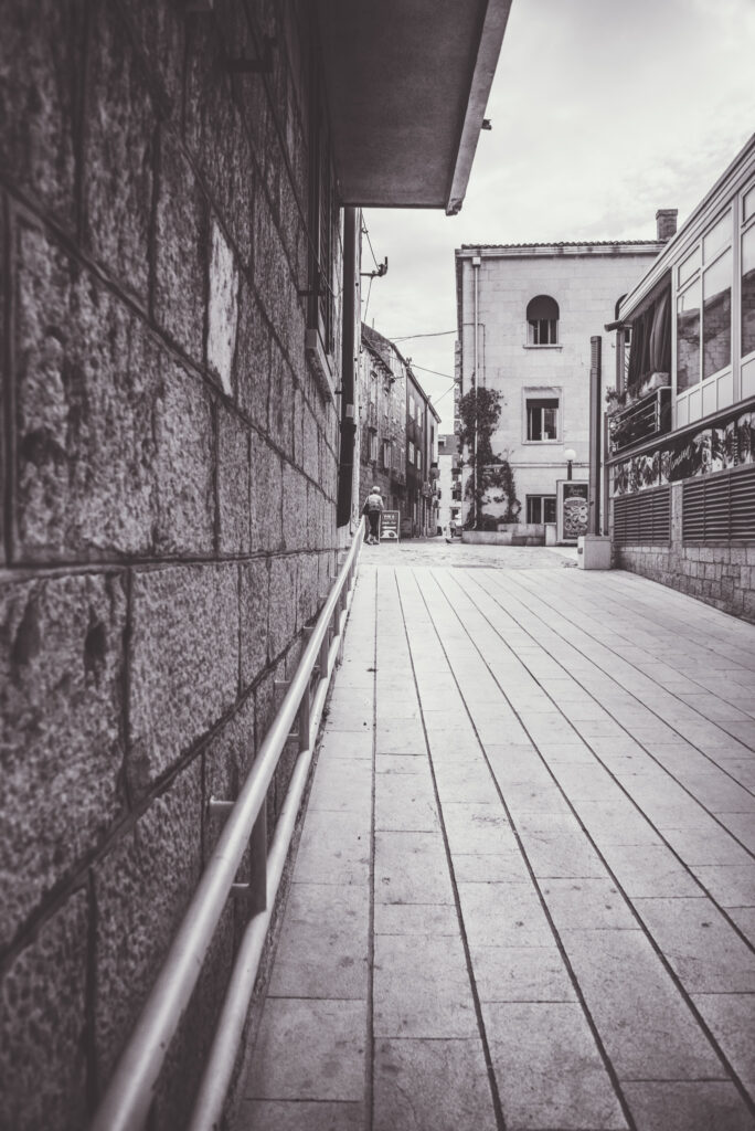 Die Vertikalität der Häuser betont die Enge des Raums, während die Fluchtlinie den Blick in die Ferne zieht, wo Licht und ein Hauch von Weite zu erahnen sind. Die Fotografie lebt von diesem Spannungsverhältnis zwischen Verdichtung und Öffnung.