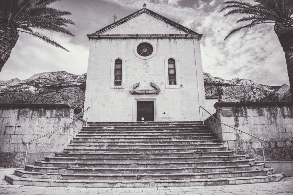 Die streng frontale Ansicht einer Kirche erhebt sich über eine breite Steintreppe, die wie eine Bühne den Zugang zur Architektur inszeniert.