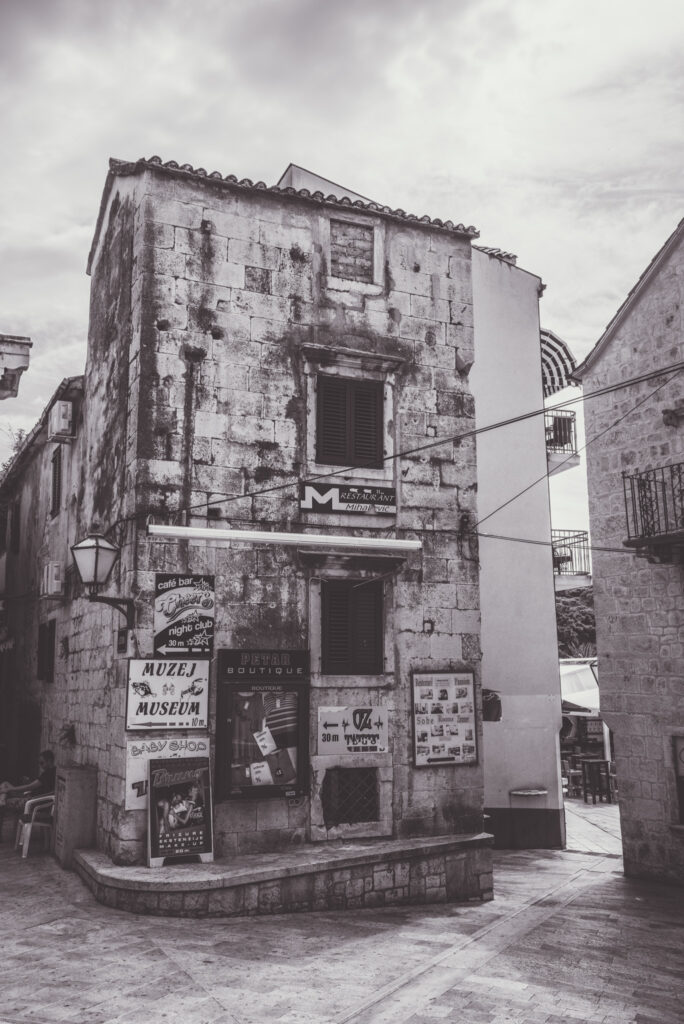 Doch diese historische Substanz wird von einer Vielzahl an Schildern überlagert: Werbung für Cafés, Museen, Boutiquen. Dieses Nebeneinander von Vergänglichkeit und Gegenwart erzeugt eine visuelle Spannung, die den Blick hin- und herpendeln lässt.