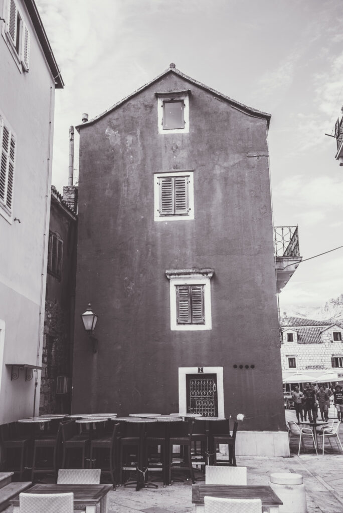 Ein schmales, hohes Gebäude mit geschlossenen Fensterläden und verblasstem Putz steht frontal im Bildzentrum. Die Einfachheit seiner Form wirkt fast monumental, doch zugleich strahlt das Haus eine stille Abwesenheit aus.