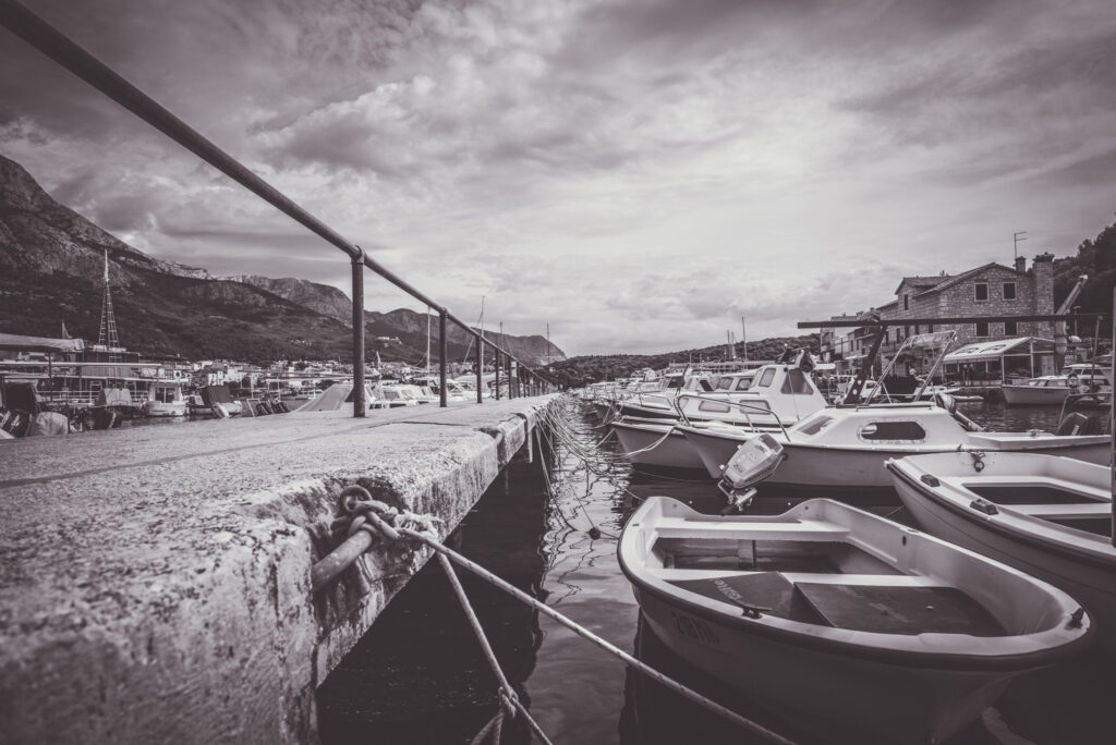 Das Schwarz-Weiß hebt die grafischen Elemente hervor und entzieht dem Motiv die sommerliche Leichtigkeit, die man mit einem Hafen verbindet – stattdessen entsteht eine stille, fast zeitlose Atmosphäre.