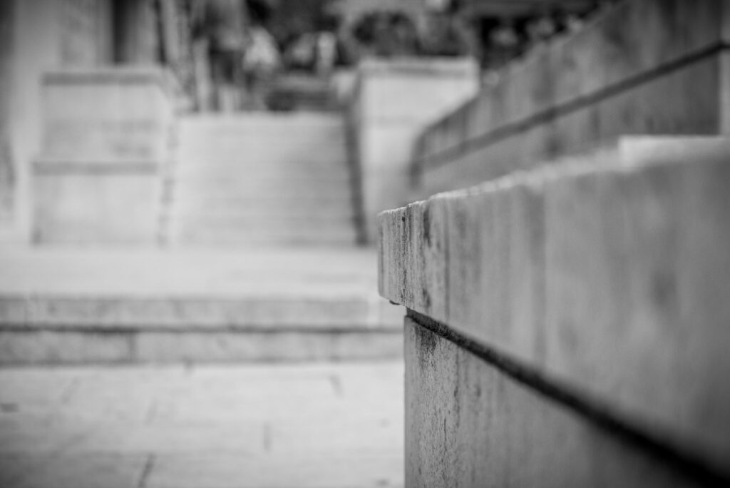Dahinter verschwimmt die Welt: breite Stufen, Mauern, vage Silhouetten von Menschen – alles in weichem Fokus, als wären es Erinnerungen, die langsam verblassen. Das Auge ruht am Rand der Mauer, wandert dann vorsichtig in die Ferne, tastet die Unschärfe ab und ahnt Geschichten, die sich jenseits der klaren Linie abspielen.