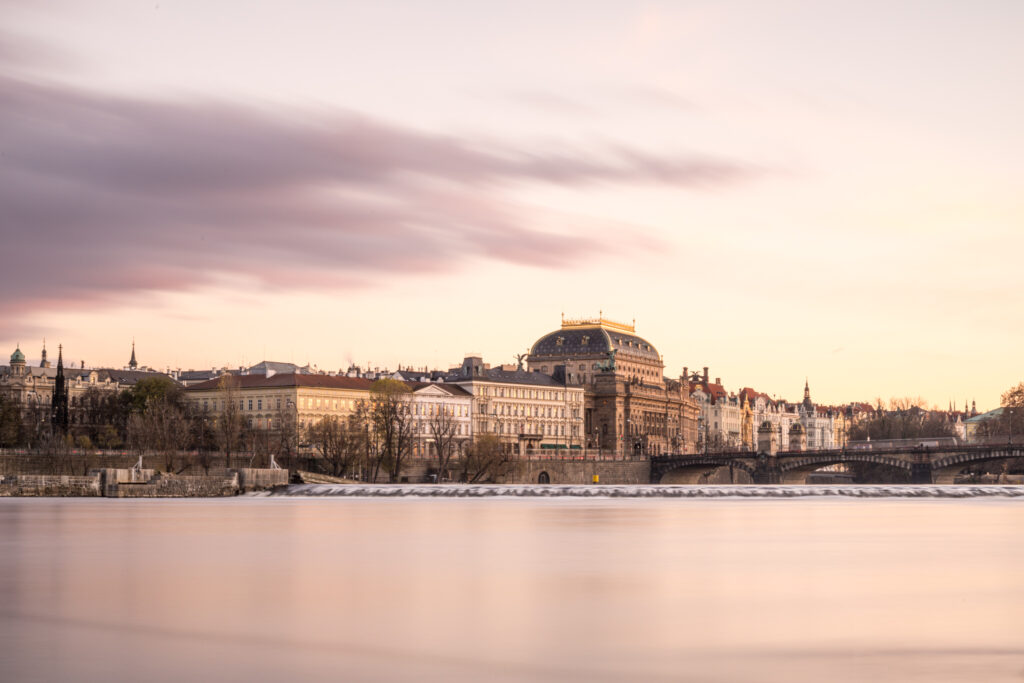 Dieses Bild zeigt die historische Kulisse von Prag im sanften Licht des Sonnenuntergangs. Im Zentrum erhebt sich das Nationaltheater mit seiner markanten Kuppel, eingerahmt von klassizistischen und barocken Fassaden.