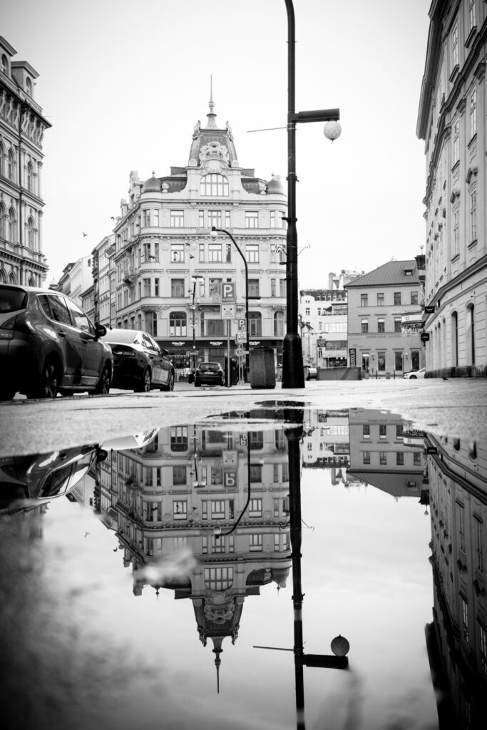 Eine Pfütze auf dem Asphalt wird in dieser Fotografie zum unerwarteten Spiegel. Sie verdoppelt das Bild der reich verzierten Fassade und macht die Szene surreal, beinahe traumartig.