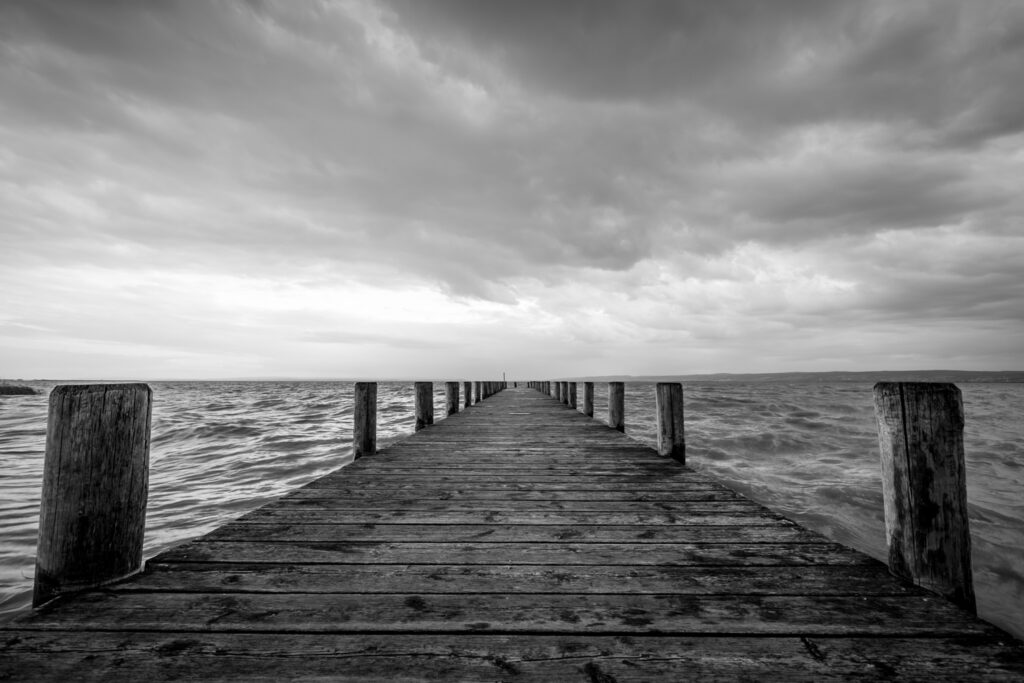 Ein langer, verwitterter Holzsteg erstreckt sich schnurgerade in die Ferne, flankiert von groben, massiven Pfosten, die ihm eine rhythmische Struktur verleihen. Er führt den Blick unaufhaltsam bis zum Punkt, an dem Himmel und Wasser nahtlos ineinander übergehen. Das monochrome Schwarz-Weiß des Bildes verstärkt die dramatische Wirkung: Die Wasseroberfläche ist bewegt und leicht aufgewühlt, während über ihr eine Decke aus schweren, dunkelgrauen Wolken hängt. Das Licht bricht nur zaghaft durch die Wolkendecke und zeichnet feine Kontraste, wodurch eine tiefe, beinahe melancholische Stimmung entsteht – ein Moment, der zwischen Ruhe und aufziehender Spannung schwebt.
