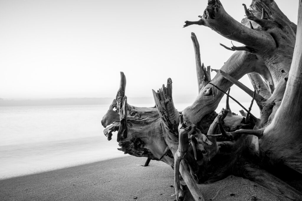 Dieses Bild zeigt ein gewaltiges Stück Treibholz, das wie eine Skulptur am Strand liegt. Die Schwarz-Weiß-Darstellung betont die kontrastreichen Strukturen und Maserungen des Holzes, das sich in spitzen Fragmenten und verwitterten Rundungen in den Raum ausbreitet.