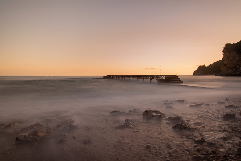Das Bild zeigt eine Küstenlandschaft in den warmen Tönen des Sonnenuntergangs. Der Steg, der weit in das Meer hinausragt, wird zum zentralen Motiv der Komposition. Er gliedert die Horizontlinie und führt den Blick in die Tiefe des Bildraums. Die lange Belichtungszeit verwandelt die Bewegungen des Wassers in eine nebelhafte Fläche, die sich weich über den Strand und die Steine legt. Dadurch entsteht ein starker Kontrast zwischen den klaren, kantigen Strukturen der Felsen und des Stegs und der aufgelösten, fast immateriellen Erscheinung des Wassers.