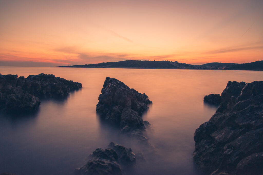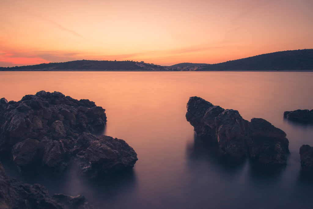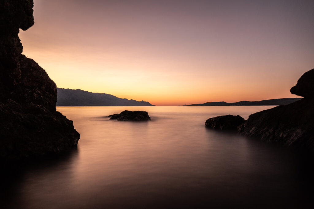 Aufgenommen in Lokva Rogoznica, Kroatien, zeigt dieses Bild die Ruhe eines Sonnenaufgangs an der Adriaküste. Zwischen dunklen Felsen öffnet sich der Blick auf das Meer, das in sanften Pastelltönen von Violett bis Gold erstrahlt.