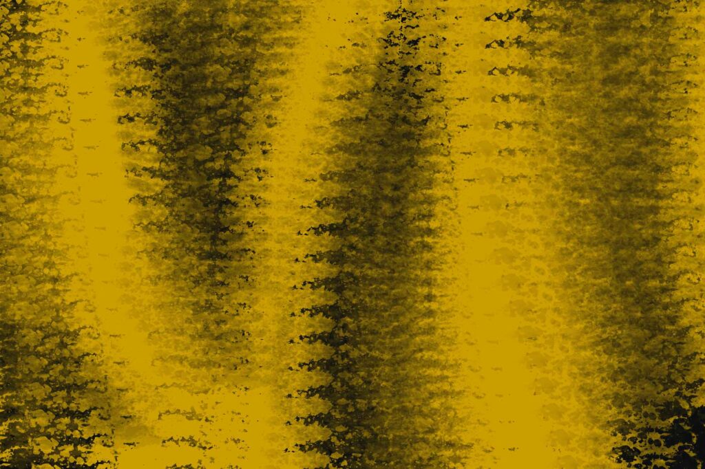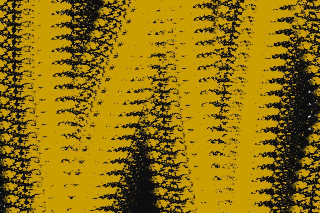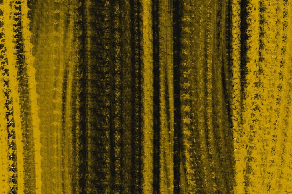 Eine dichte Abfolge vertikaler Streifen dominiert das Bild. Die scharf gesetzten Gelbflächen kontrastieren mit aufgebrochenen Schwarzstrukturen, wodurch eine starke grafische Wirkung entsteht. Das Zusammenspiel von klarer Ordnung und brüchiger Textur evoziert das Bild einer Oberfläche, die von Zeit und Abnutzung gezeichnet ist.
